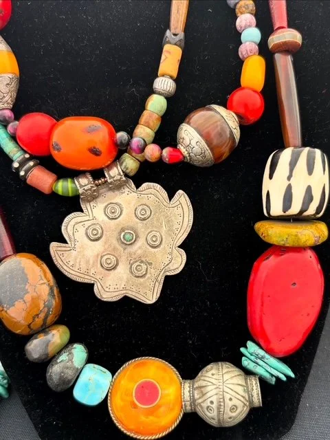 My mixed-media jewelry includes numerous rare finds—many incorporating relics and ancient representations of cultural beliefs, traditions, or sacred emblems from across the globe. I often include amulets, also called talismans. In many cultures they are believed to possess an unearthly power to protect, heal and bring good fortune. Each piece of my jewelry is designed with a juxtaposition of rare glass and tribal components positioned next to contemporary colorful gemstones, ceramics, beads, charms, and tassels. The asymmetry in my work offers a creative palette of colors that “pop” next to subdued metals and organic forms.